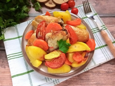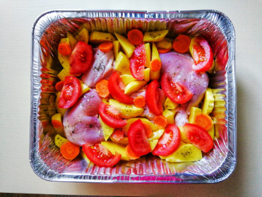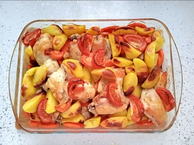 Запекала курицу с овощами 1 час 20 минут. Картошка и помидоры зарумянились, а из курочки вытекал прозрачный сок. Значит готово!