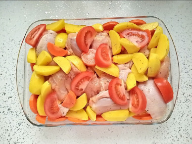 Следом нарежьте помидоры и также равномерно разложите их по всей поверхности. Поставьте форму в духовку, разогретую до 200 градусов, на 1 час. Благодаря тому, что все ингредиенты покрыты тонким слоем масла, они не будут сохнуть и хорошо пропекутся внутри.