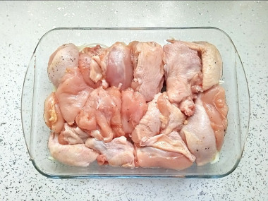 Части курицы хорошо обмажьте масляной смесью со всех сторон и выложите в форму для запекания.