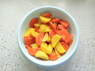 Картошку нарезала крупными дольками. Болгарский перец запекать не хотелось, поэтому не использовала его. Зато включила в список овощей морковь, она получается вкусной. Овощи тоже перемешала с маслом, в которое добавила приправу для картофеля и паприку.