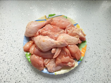 У меня была целая курица весом 1,6 кг. Разделала ее на части, промыла, обсушила и обваляла в масле с добавлением приправы для курицы и черного перца.