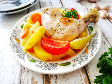Мы соскучились по запеченной курочке. Поискала рецепты на сайте и остановилась на курице с картошкой и овощами в духовке. Тут сразу и мясо и гарнир, что очень удобно.