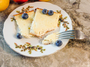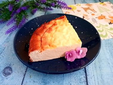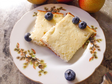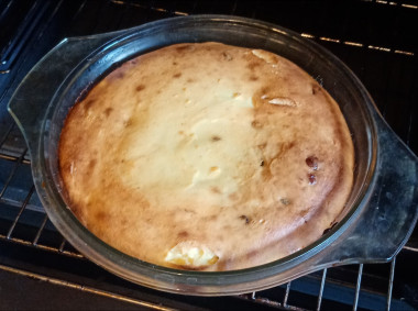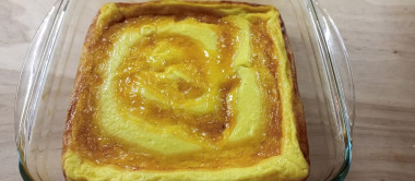 Запеканка сначала сильно поднялась, а потом немного осела сверху. Она хорошо подрумянилась, из формы вышла без проблем. Консистенция нежная, однородная. Вкус восхитительный!