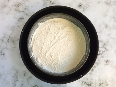 Продуктов взяла на 6 порций. Творог был крупными хлопьями, поэтому взбила его погружным блендером вместе с яйцами и сахаром. Так же добавила щепотку соли. После настаивания с манкой получилась густая пастообразная масса.