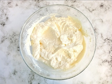 Перемешайте все продукты. Я сначала мешала ложкой, затем, для полной однородности, использовала ручной венчик. Можно предварительно не перетирать творог, а пробить блендером творожную массу на этом этапе.