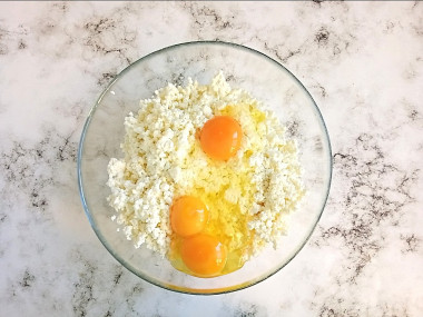 Переложите творог в миску. Если он у вас сильно крупинчатый, то лучше протрите творог через сито или пробейте погружным блендером. Если творог сильно сухой, то можете добавить пару ложек сметаны. Вбейте в миску с творогом яйца. Обязательно мойте яйца перед использованием, так как даже на кажущейся чистой скорлупе могут находиться вредные бактерии. Лучше всего использовать моющие средства для пищевых продуктов и щетку.
