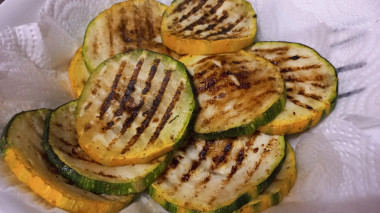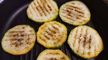 Сковородку - гриль, слегка, помазала растительным маслом, оливкового не было и поставила на средний огонь. На разогретую сковородку, поместила кабачки и жарила до появления золотистых полосок. Обжаренные кабачки - гриль, разложила на тарелку с бумажной салфеткой для впитывания лишней влаги.