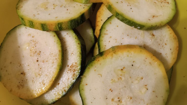 Я взяла кабачок, порезала на кружочки, посыпала солью, специями и оставила на несколько минут для впитывания.