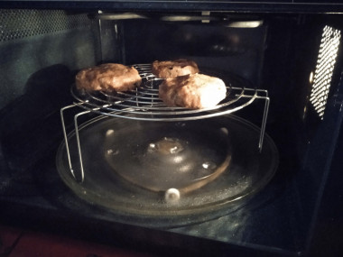 Захотелось мне сделать котлеток гриль. Нашла хороший рецепт "котлеты на электрогриле", только нет у меня электрогриля, к сожалению. Решила приготовить блюдо по этому рецепту, но запекать в микроволновке на решетке гриль с функцией гриль. Фарш у меня покупной, я добавила к фаршу измельчённого лука и чеснока, а также зелени и приправу для гриля, немного соли и перца. Впервые налила в фарш минералку по совету автора. Настраивался он у меня сутки в холодильнике. Формировала котлетки руками, старалась придать им круглую форму. Прекрасная идея убрать котлеты в морозилку, иначе бы они у меня провалились на решетке😉