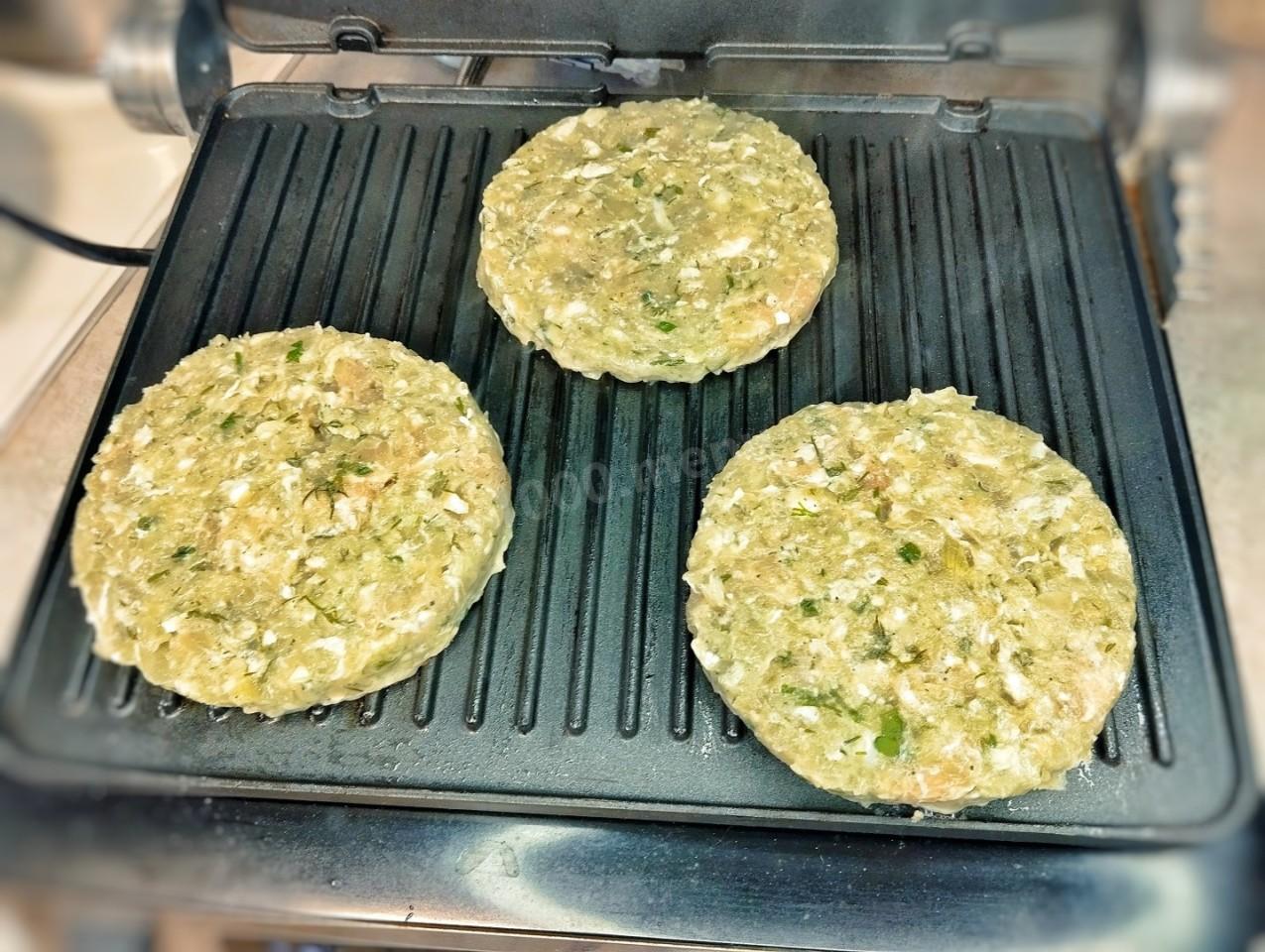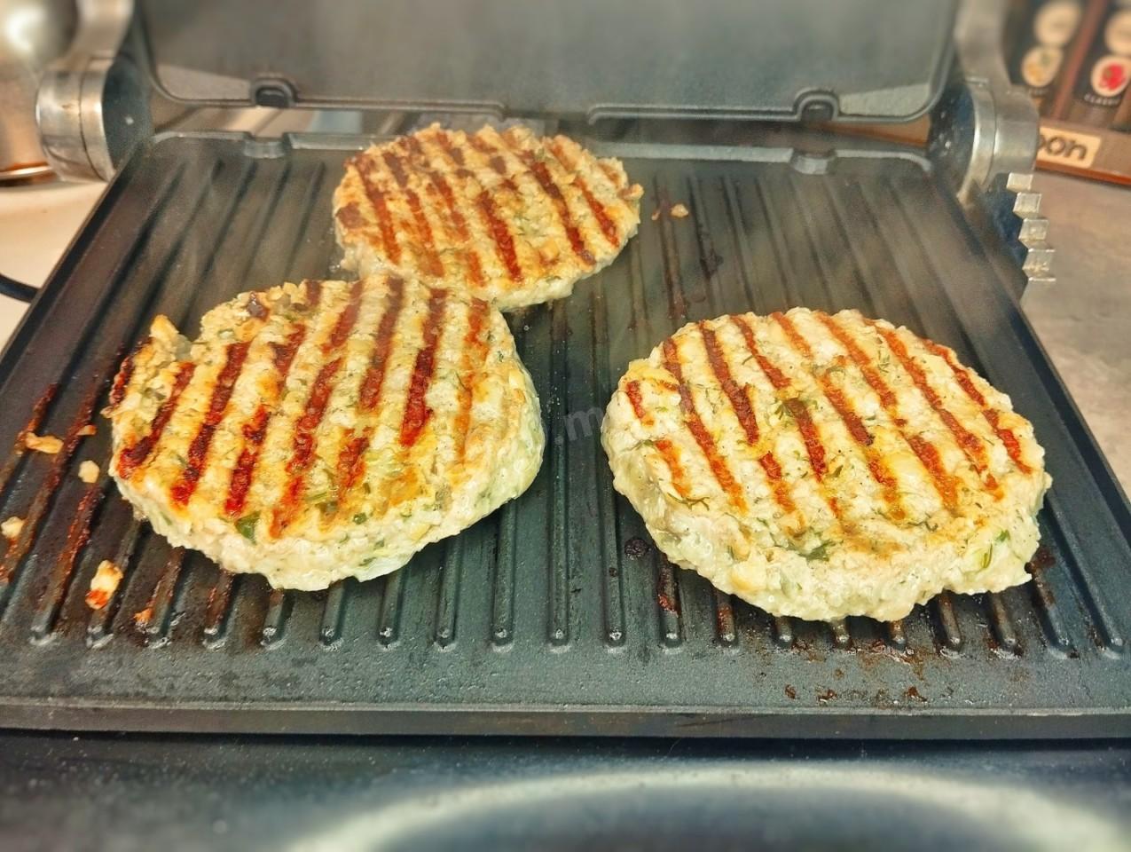 Пока котлеты охлаждаются, включите электрический гриль и нагрейте его до высокой температуры, предварительно смазав небольшим количеством оливкового масла. Положите готовые котлеты на горячий гриль.