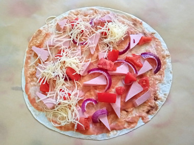 У нас в семье все любят пиццу, но иногда просто нет времени заниматься тестом. Тогда выручают другие виды пиццы: на хлебе, лаваше или тортитьи. На сайте я увидела рецепт пиццы на лепешке тортилья. Очень просто в приготовлении и быстро. У меня не было именно мексиканской лепёшки, зато был круглый лаваш. Не знала, получится ли сделать пиццу на нём, но рискнула попробовать. Сразу положила лепёшку на пергамент, смазала соусом и разместила начинку. Колбаса у меня вареная, грибы не добавляла по просьбе дочки. Запекала пиццу 5 минут. За это время колбаса немного подпеклась, сыр успел расплавиться, а лук остался слегка хрустящим. Лепёшка легко соскользнула на тарелку, а нарезала я её ножницами. Очень вкусно получилось. Действительно лепёшку можно свернуть трубочкой и взять с собой. Это идеальный перекус!