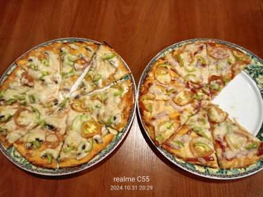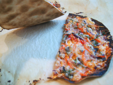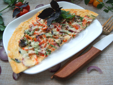 Я такую пиццу делала-вкусно и ооочень просто!!! Только я беру одну лепешку, промазываю ее майонезом или соусом, посыпаю сыром, накрываю второй лепешкой, смазываю кетчупом и выкладываю начинку!!!
