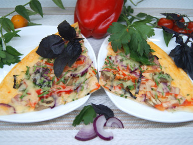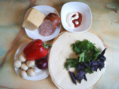 Поскольку лепешка довольно тонкая, то выложим ее сразу на противень, застеленный пергаментной бумагой, предназначенной для выпечки. Теперь подготовим все необходимые ингредиенты, которые понадобятся для приготовления пиццы. Следует обратить внимание, что все ингредиенты следует нарезать очень тонко и маленькими кусочками, так как иначе получится совсем невкусно, все ингредиенты «забьют» оригинальный мексиканский вкус тортильи и в итоге будет одна сплошная начинка. Все овощи чистим и моем. Колбасу нарезаем тонкими круглишками. Которые делим на 4 части. Сыр трем на крупной терке. Лук нарезаем тонкими полукольцами, сладкий болгарский перец стараемся нарезать также маленькими продолговатыми кусочками. Шампиньон моем. Режем пластинами, которые режем пополам. Слегка обжариваем на растительном масле, после чего перекладываем на салфетку, чтобы в салфетку впиталось лишнее масло. Теперь приступим к сборке пиццы. Лепешку промазываем кетчупом, затем поочередно раскладываем все ингредиенты на лепешку, стараясь равномерно распределить их по всей ее поверхности. Сначала выкладываем кусочки колбасы, грибы и сверху перышки красного лука. Затем выкладываем кусочки болгарского перца, добавляем немного майонеза в виде капелек и сверху посыпаем пиццу тертым сыром. Разогреваем духовой шкаф до 200°С, после чего отправляем противень с пиццей в духовку и выпекаем пиццу в течение примерно 5-7 минут, не больше, поскольку из-за использования очень тонкой лепешки, пицца превратится в «сухарь». В этом случае, пусть лучше сыр не успеет хорошо расплавится. Но зато лепешка останется мягкой и только с краев будет немного хрустящей. Готовую пиццу достаем из духовки, нарезаем на порционные кусочки и горячую подаем на стол.