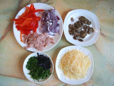 Все ингредиенты из списка я подготовила: все что нужно порезала, шампиньоны обжарила, болгарский перец нашинковала овощечисткой. И от себя еще добавила зелень, которую очень люблю.