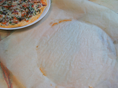 Мне даже показалось, что в моей духовке на пиццу вполне хватило 5 минут, но тут все индивидуально. На противень я положила пергамент, и к нему ничего не прилипло.