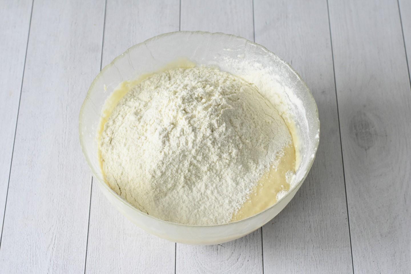 В кефирную смесь частями добавьте просеянную с содой и солью муку.