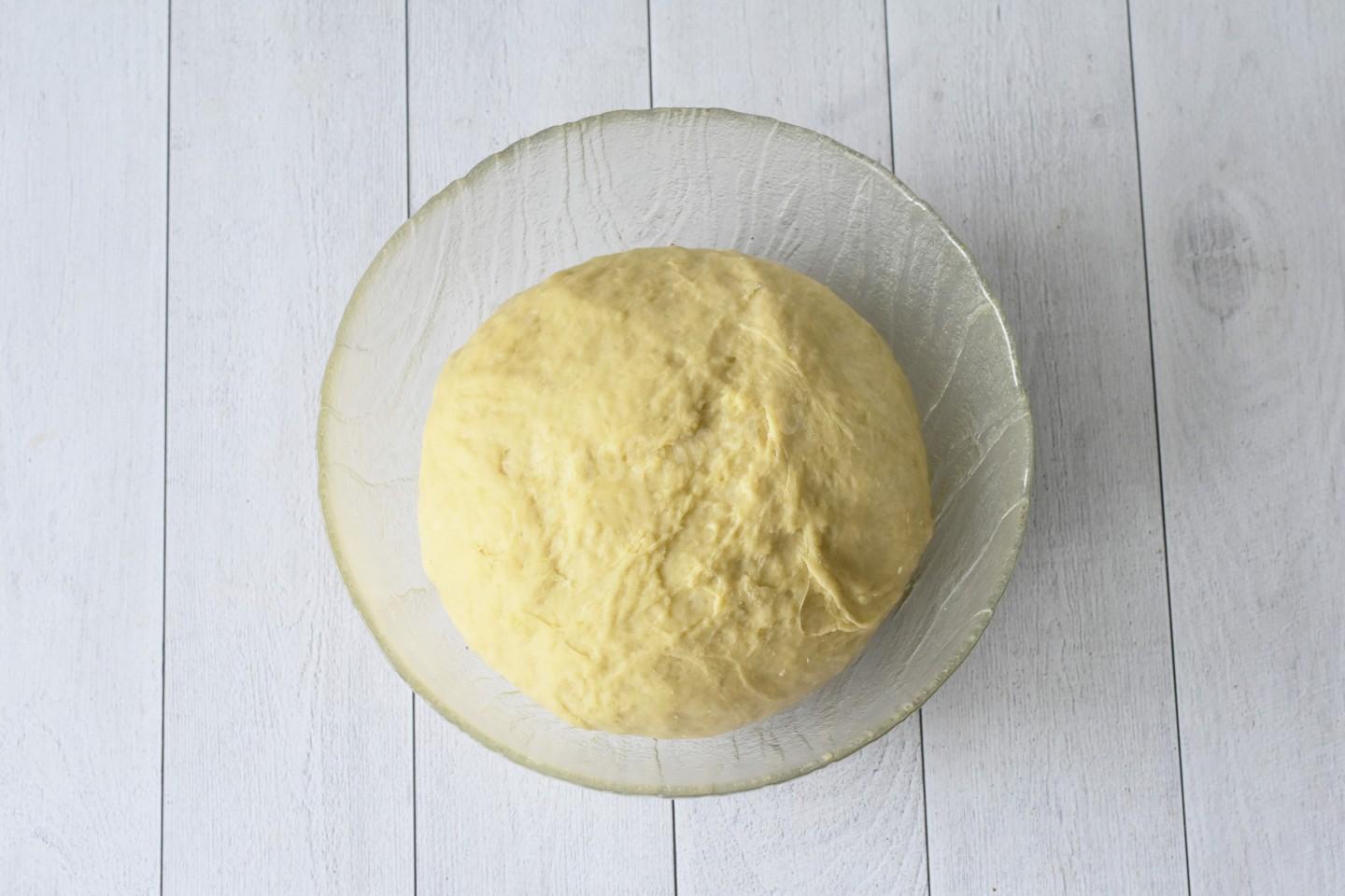 Замесите гладкое однородное нелипкое тесто, при необходимости подсыпая понемногу еще муки. Но не забивайте все тесто мукой, чтобы оно не утратило эластичность. Лучше потом при формовке булочек посыпать стол и скалку мукой. Тесто само возьмет, сколько ему нужно.