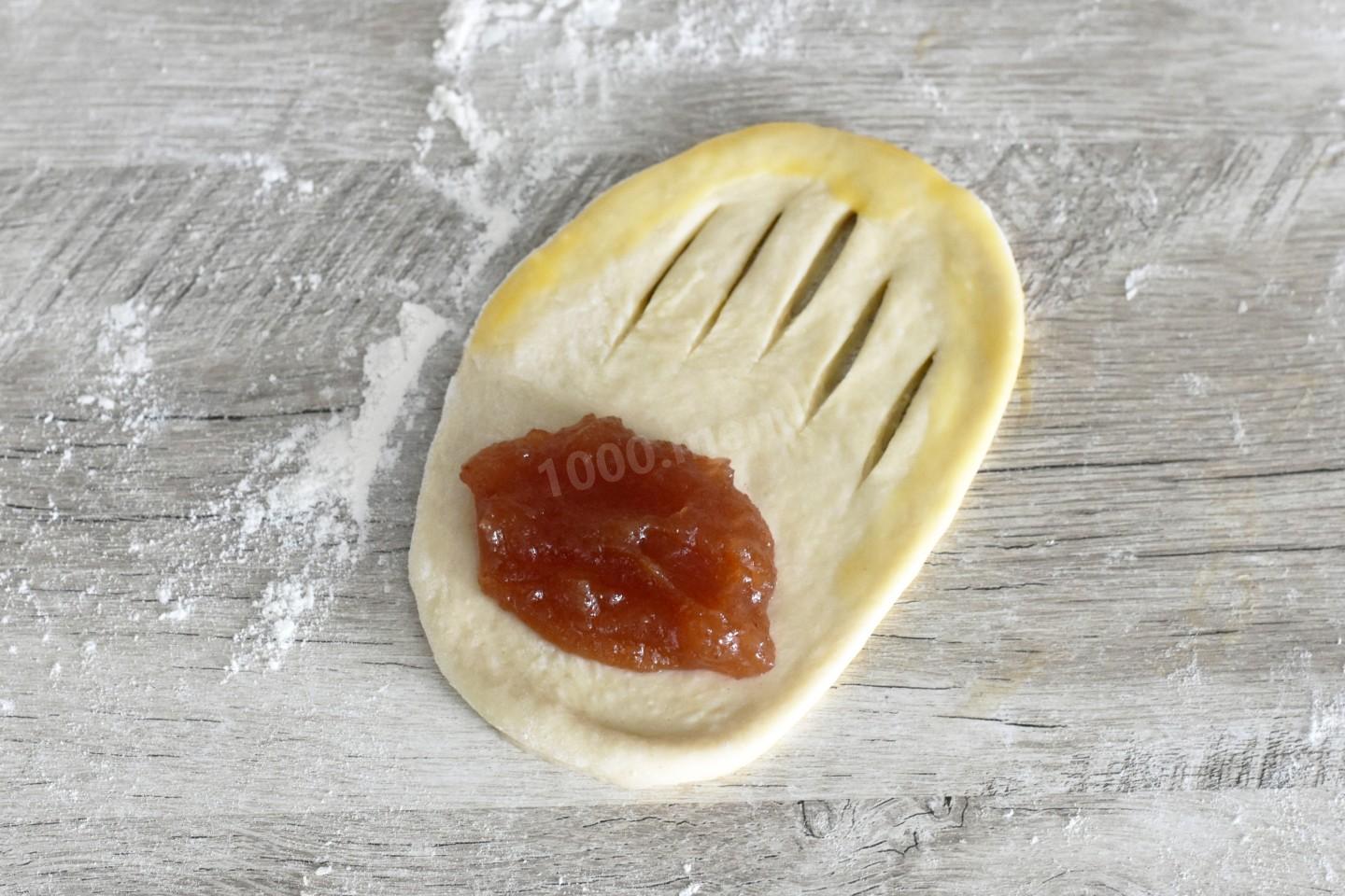 Тесто обомните и разделите на одинаковые части весом около 50 г каждый. Каждый кусочек раскатайте в овал. Как завернуть булочки с повидлом? С одной стороны сделайте на тесте надрезы. На другую сторону выложите 1 ст. л. повидла. Один край теста смажьте желтком с молоком. Накройте начинку половиной теста с надрезами и защипайте края. Выложите заготовки на застеленный пергаментом противень на расстоянии друг от друга. Смажьте булочки взбитым яйцом.