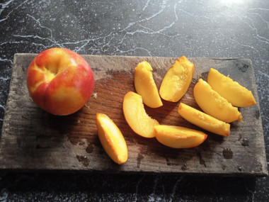 Вымытые персики, обсушите, удалите косточки и нарежьте дольками среднего размера.