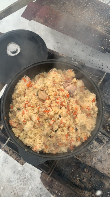 Главный момент - это не передержать рис под закрытой крышкой, иначе может получиться каша вместо плова. Откройте крышку, плов аккуратно перемешайте. Если в казане осталась ещё жидкость, то подкиньте пару дровишек в костёр и оставьте до тех пор, пока вода не выкипит. Вкусный плов на костре в казане готов!