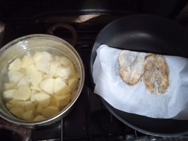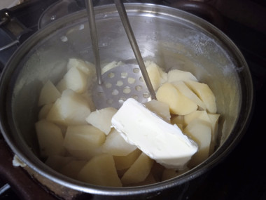 До того, как заняться рыбой, поставила вариться картошку. Когда она стала мягкая, добавила кусочек сливочного масла и немного теплого молока. С помощью толкушки сделала пюре. С молоком оно получилось нежное и вкусное.