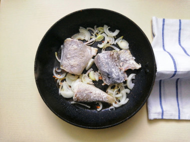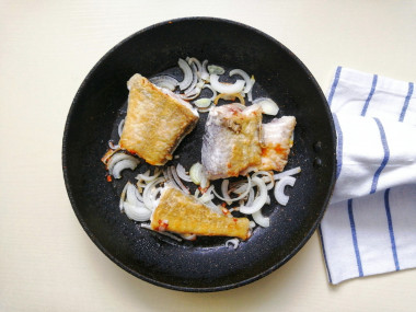 Сделала сегодня на обед картофельное пюре с рыбой. У меня была треска, всего одна рыбка. Почистила ее, помыла, разрезала на три части, обваляла в муке (муку перед этим соединила с солью) и отправила на сковородку. Обжаривала рыбу до румяной корочки - по 7 минут с каждой стороны. Пока обжаривалась одна сторона, почистила и нарезала лук. Выложила его в сковородку, жарила вместе с рыбой.