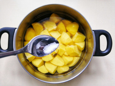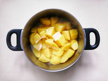 Произвольно нарежьте очищенный картофель и выложите в кастрюлю, где будете готовить пюре.
