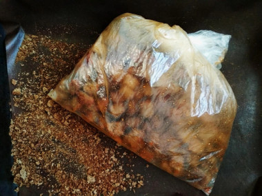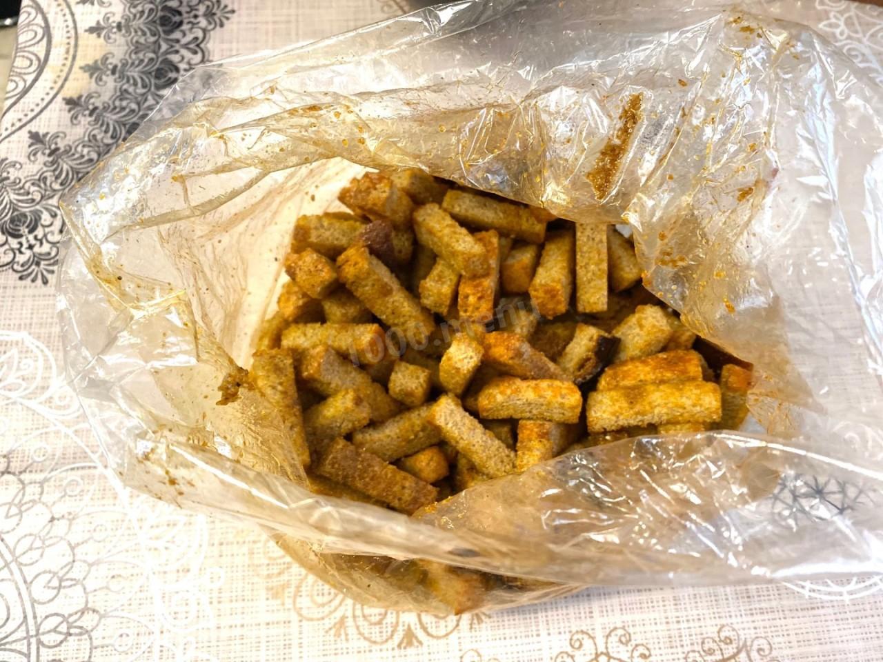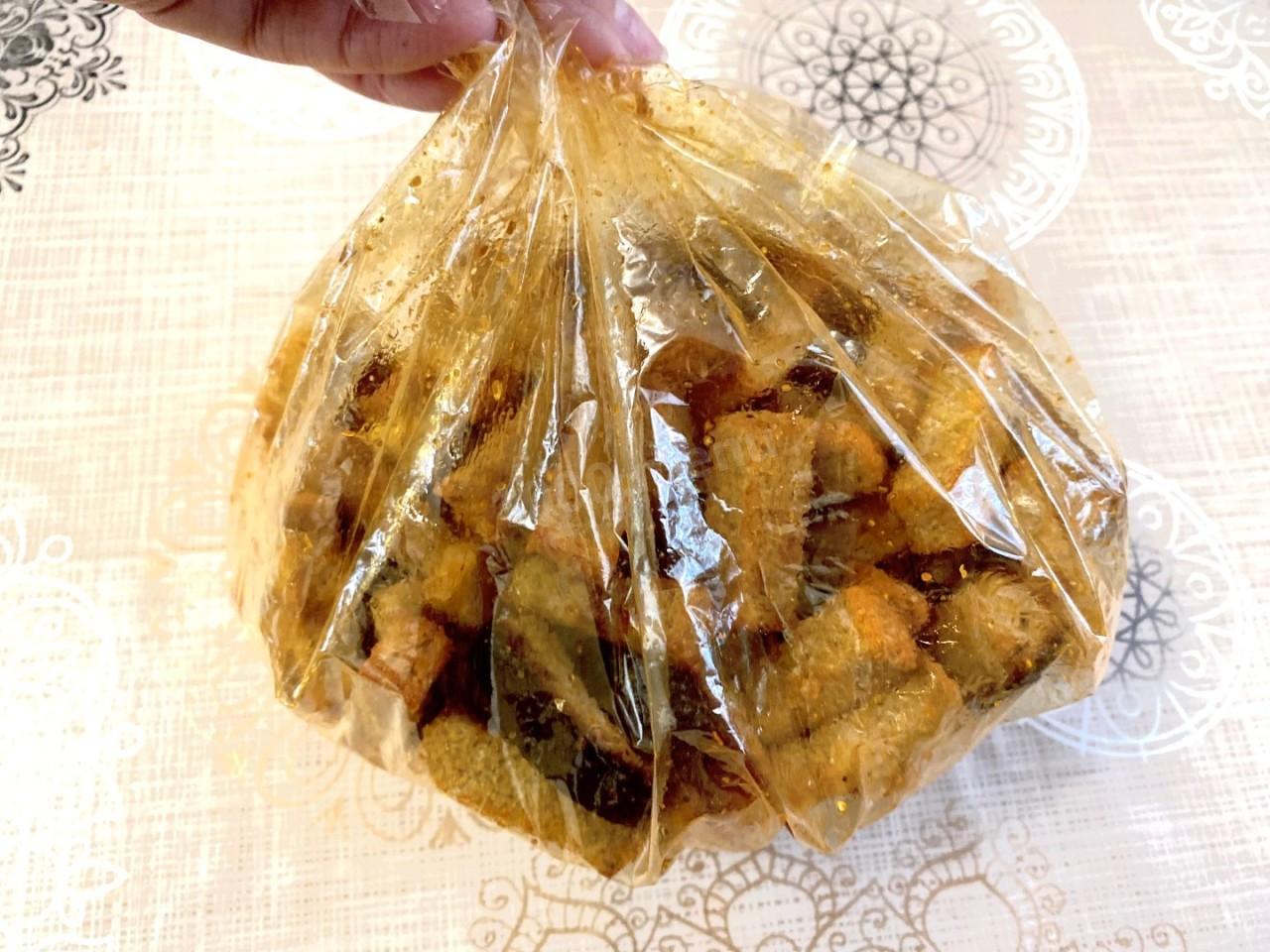 Все готовила по рецепту, сначала подсушила хлеб, потом пропитала все заправкой, вместо пакета взяла рукав для запекания, он плотный и в нем можно очень хорошо потрясти сухарики, чтоб они по-лучше пропитались.