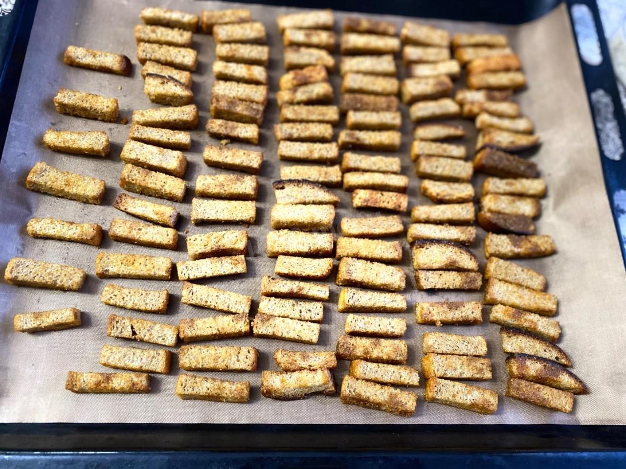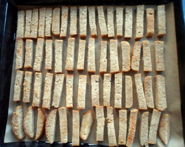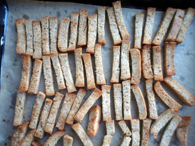 Разложите сухарики в масле обратно на противне и верните в духовку. Готовьте еще около 15-20 минут при той же температуре.По истечении времени выньте готовые сухарики из духовки и дайте им остыть при комнатной температуре. После охлаждения переложите сухарики в подходящую ёмкость и подавайте к столу. Приятного аппетита!
