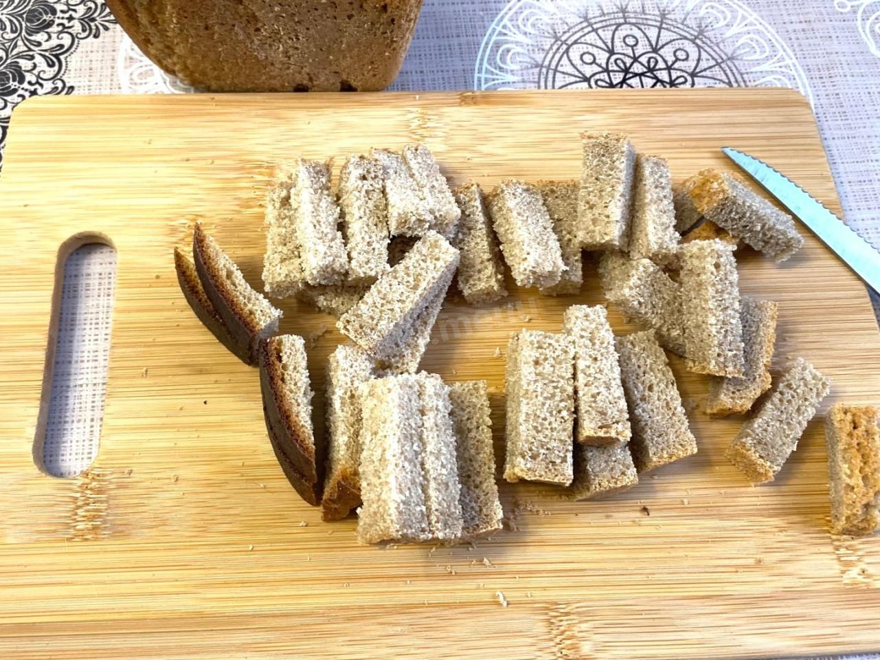 Нарежьте хлеб кусочками любой формы: брусками, большими ломтями или соломкой. Часть я нарезала брусочками, а часть кубиками. Включите духовку разогреваться до температуры 160 °C.