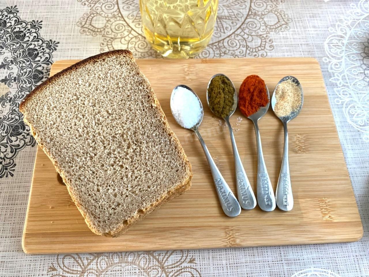 Как сделать сухарики со специями в духовке? Подготовьте все необходимые ингредиенты для приготовления сухариков. Желательно взять подсохший хлеб, но подойдет и свежий.