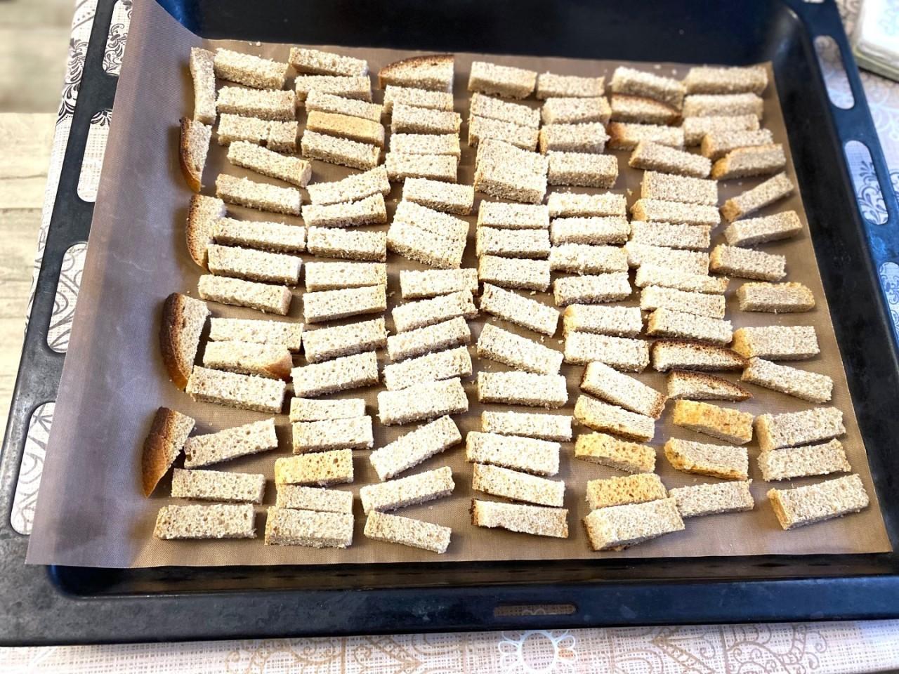 Разложите нарезанный хлеб на противне, предварительно застелив его пергаментом, и поставьте в горячую духовку на 5-7 минут.