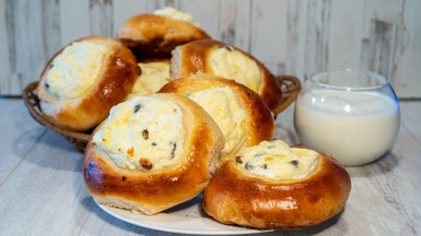 Захотелось приготовить чего-то вкусненького к чаю и тут на помощь пришел этот рецепт ватрушек с творогом. Первым делом подогрела молоко и добавила к нему дрожжи и сахар, все перемешала. Оставила подниматься опару на 10 минут. Затем добавила яйцо, сливочное масло и соль, все хорошо перемешала. Начала всыпать муку с разрыхлителем частями. Вымешала тесто, накрыла полотенцем и убрала в духовку с включенной лампочкой до увеличения теста в объеме. Когда тесто поднялось, разделила его на 10 частей примерно по 90-95 г. Скатала шарики и разложила на противень. Мокрым дном стакана сделала углубление в шариках теста. Для начинки смешала: творог, яйцо, сахар, ванилин, еще по своему вкусу добавила 150 г изюма. В углубления теста выложила творожную начинку, и смазала взбитым яйцом, но и этого мне было мало. Я соединила 30 г масла и 50 г муки, растерла в песочную крошку и присыпала сверху ватрушки. Выпекала в разогретой духовке при 180 градусах 30 минут. Ватрушки зарумянились, вытащила их из духовки и оставила немного остыть.