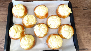 Пеките ватрушки в духовке, разогретой до 175°С, 20-30 минут. Точное время будет зависеть от особенностей вашей духовки и размера ватрушек. Узнать об особенностях работы духовок можно, прочитав отдельную статью, ссылка в конце рецепта. Готовность определите по виду — тесто поднимется и зарумянится. Достаньте противень из духовки, снимите с него горячие ватрушки и остудите их.