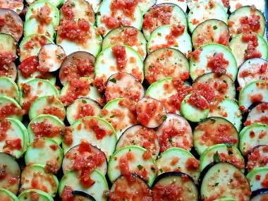 Готовила я из двух небольших баклажанов и примерно таких же по размеру двух кабачков. Кружки нарезала толщиной 5 мм. Выкладывала слегка внахлест, у меня получился целый большой противень. Баклажаны предварительно посолила и оставила на 15 минут. Затем быстро промыла под проточной водой и осторожно отжала.
