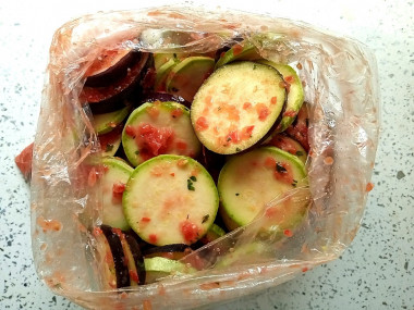 Залейте баклажаны и кабачки соусом и хорошо их перемешать. Я для удобства использую целлофановый пакетик, в нём за несколько секунд можно равномерно распределить маринад по всем кружочкам.