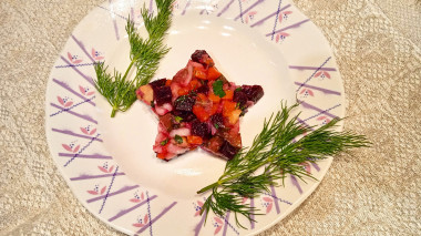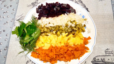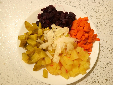 В нашей семье любят винегрет без горошка классический, даже дочка с удовольствием его ест) Захотелось сделать его без горошка и капусты, тем более в закладках был соответствующий рецепт. Пропорции увеличила вдвое. Свеклу решила не варить, а запечь в микроволновке, так выходит быстрее. Четыре большие свеклы сложила в пакет, завязала и готовила 20 минут. Как раз картошка с морковью сварились к этому времени. Резали овощи на пару с дочкой) Огурцы у меня свои, уже весна, пора доедать запасы) Так как огурцы были средней солености, салат немного посолила и добавила черного перца из мельнички. Приготовила все с вечера, перемешала и оставила до утра. Мне нравится этот насыщенный цвет и вкус винегрета. Утром заправила маслом и все с удовольствием позавтракали. Салат очень вкусный, с ярким вкусом свеклы и пикантным привкусом соленых огурчиков. Лук здесь тоже очень хорошо дополняет салат. Спасибо за прекрасный и нужный рецепт!