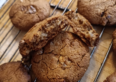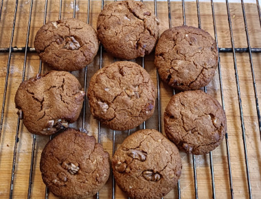 Печенье получилось красивого коричневато-золотистого цвета, с аппетитыми трещинками, ароматное (мёд и корица прекрасно сочетаются), орешки хрустят. Вмеру сладкое. Очень вкусно!