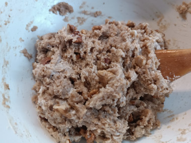 На данное количество ингредиентов добавила 40 г ядер грецких орехов, которые не стала сильно измельчать, чтобы вкус орешков отчётливо чувствовался.