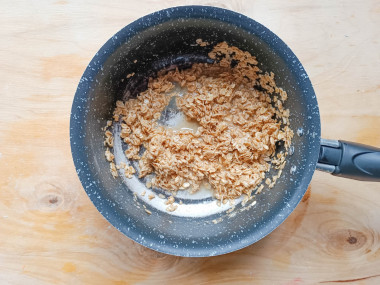 Влейте медовую смесь в хлопья, хорошо перемешайте. От тепла они немного размякнут. Если у вас хлопья не быстрого приготовления, то оставьте их постоять в таком виде минут на 10.