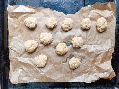 Противень застелите бумагой для выпечки или специальным ковриком. Руками сформируйте печенье в виде шариков. Положите их на бумагу и слегка расплющите сверху.