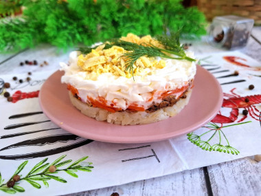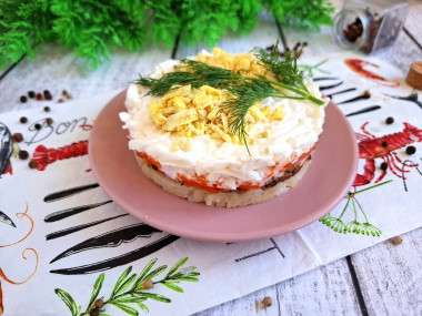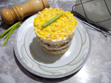 решила приготовить простой и быстрый салат мимоза со шпротами. Лук предварительно замариновала минут на 10, затем ошпарила кипятком и смешала с майонезом, чтобы он стал мягким и не выделялся среди продуктов. Слоеный салат очень удобно делать в кольце для выпечки. Слегка утрамбовала слои. Соль и перец не использовала. Жидкости в рыбной консерве было немного, поэтому полностью оставила и с ней измельчила рыбу. Салат получился очень вкусный и всем понравился!