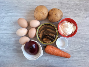 У шпрот я удалила хвостики, а тушки немного размяла вилкой. Масса достаточно сочная благодаря ароматному маслу. Поэтому она прекрасно пропитывает картошку. Лук я взяла красный - он вкусный, сочный и хрустящий. Для дополнительной пикантности замариновала лук в яблочном уксусе с щепоткой сахара. Все овощи и яйца отдельно натерла на тёрке с крупными зубцами. Майонез разбавила густой сметаной для большей нежности. Салат пропитывался в течение ночи в холодильнике. Получилось вкусно и сочно!