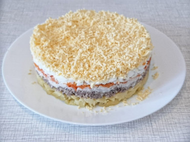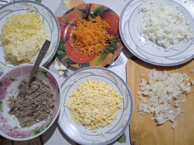 Салат Мимоза со шпротами выкладываем слоями в следующем порядке: