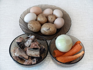 Начнем приготовление салата Мимоза со шпротами с подготовки ингредиентов: заранее отвариваем яйца, картофель и морковь. Охлаждаем и очищаем их.