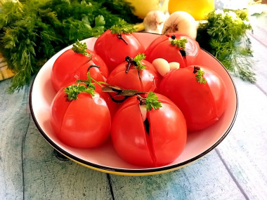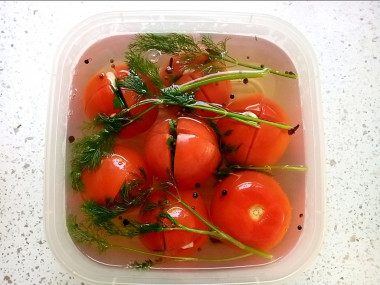Мне захотелось маринованных помидоров быстрого приготовления. Нашла подходящий рецепт, главное для меня, что тут есть чеснок, но его не много.