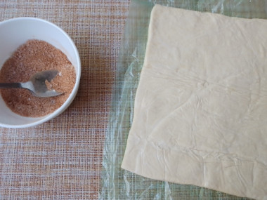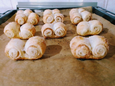 Раскатала пласт слоеного теста посыпала его сахаром смешанным с молотой корицей и скрутила с двух сторон. Благодаря воде завитушки хорошо склеились между собой и только во время приготовления парочка рассоединилась. Сверху обваляла нарезанные кусочки в обычном сахаре.