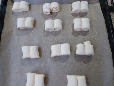 Свернутое тесто нарежьте на части, шириной 1,5-2 см. Каждый кусочек обваляйте со всех сторон в сахаре.