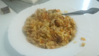 Мясо и овощи хорошо приготовились, рис распарился, стал рассыпчатым, ароматным, а колбаса придала паэлье, которая получилась очень сытной, интересный вкус.