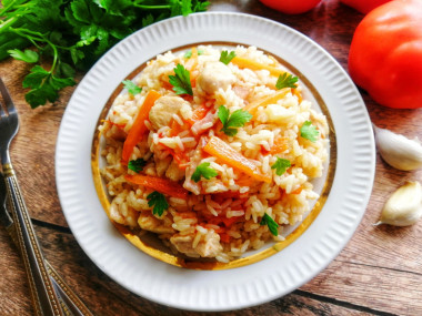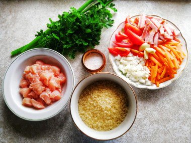 Куриное филе помойте и обсушите бумажными салфетками. Нарежьте мясо кубиками размером примерно 2 на 2 см. Овощи почистите и помойте. У болгарского перца удалите семена и плодоножку. Чеснок можно оставить в кожуре. Морковку, лук, болгарский перец и колбасу нарежьте мелким кубиком. С помидора предварительно по желанию можно удалить кожуру, обдав томат кипятком. Если у вас обычный помидор, то также нарежьте его кубиком.